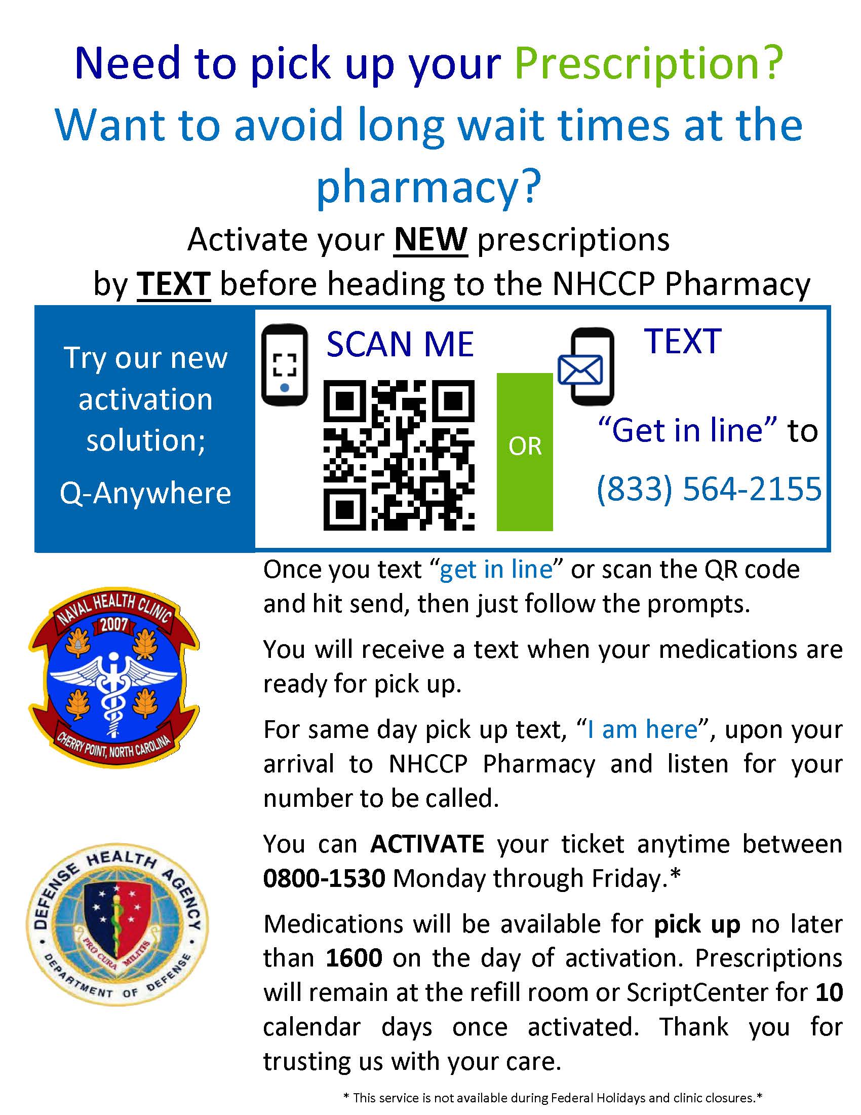 - Visit the Pharmacy inside Naval Health Clinic Cherry Point during normal clinic business hours and proceed to take a ticket from the kiosk. Processing time varies based on pharmacy staffing and resources.